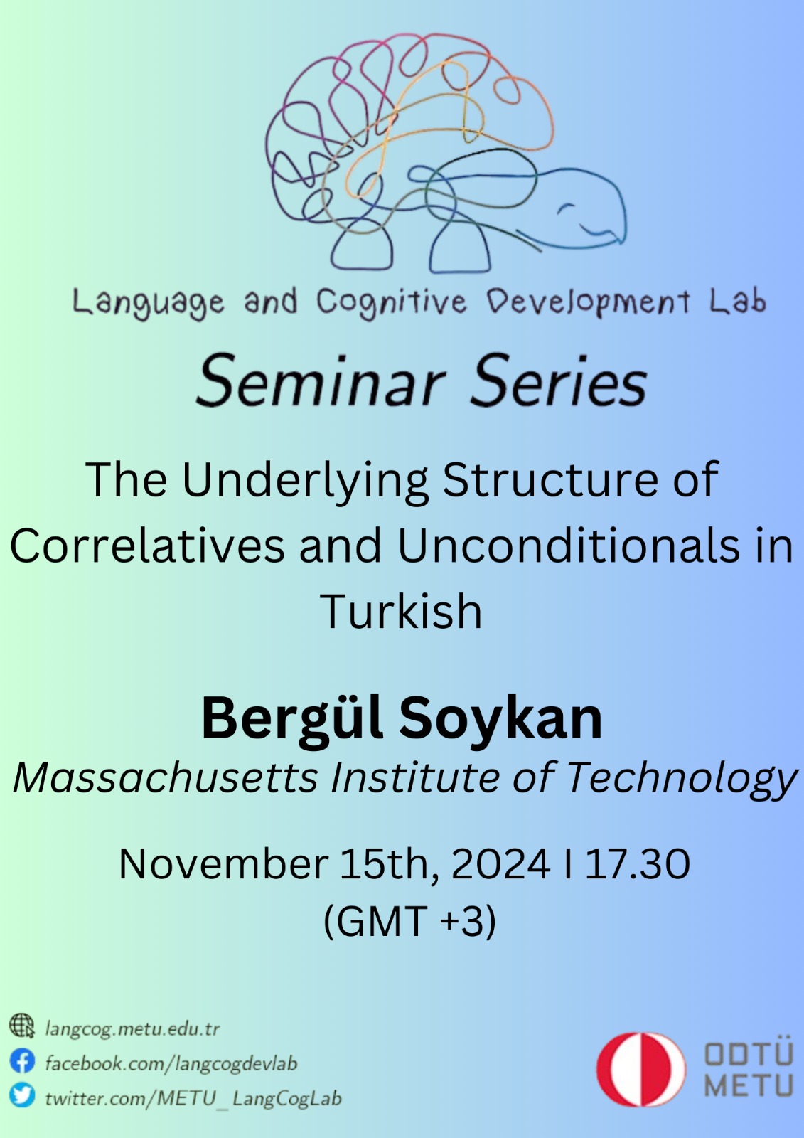 Bergül Soykan from Massachusetts Institute of Technology will virtually visit our lab on November 15th and give a speech titled 'The Underlying Structure of Correlatives and Unconditionals in Turkish'. For participation information, please contact lcd@metu.edu.tr