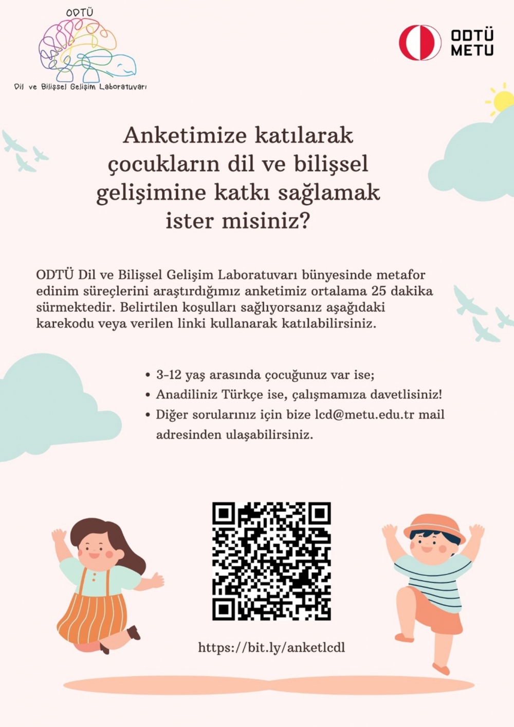3-12 yaşlarında anadili Türkçe olan çocuğunuz varsa çalışmamıza davetlisiniz! Çocuklarda mecaz anlamın edinim yaşlarını incelediğimiz çalışmaya aşağıdaki link üzerinden ulaşabilirsiniz.